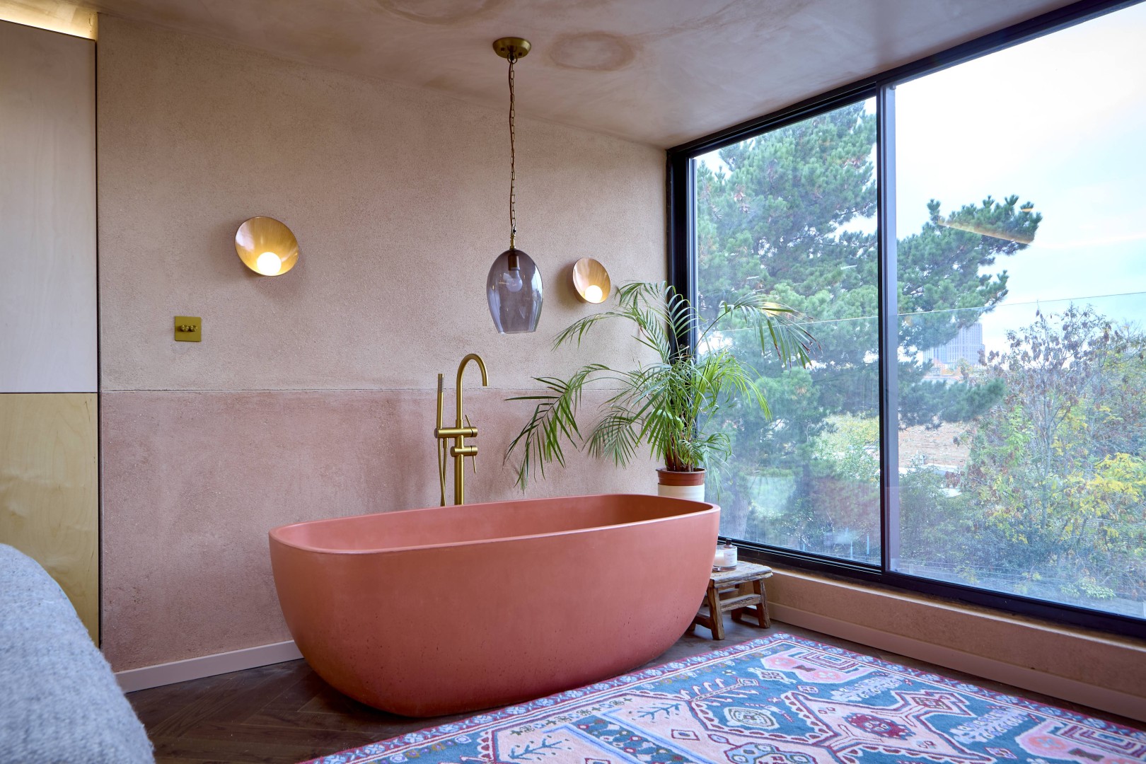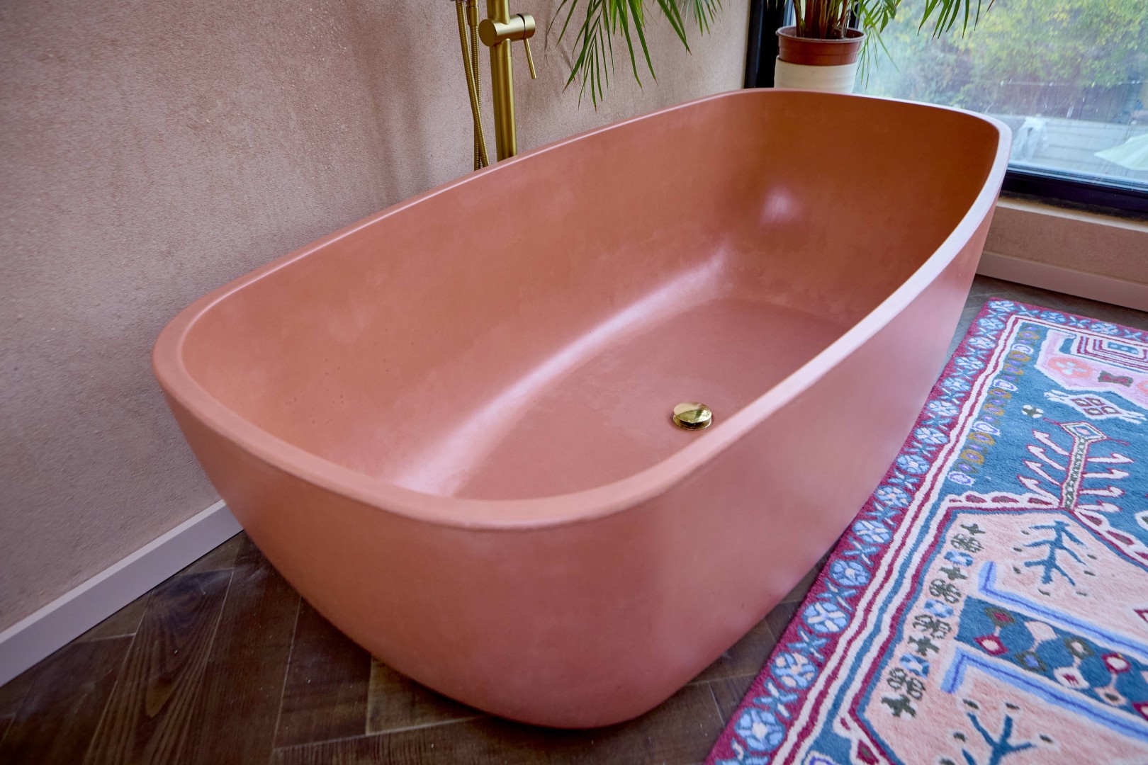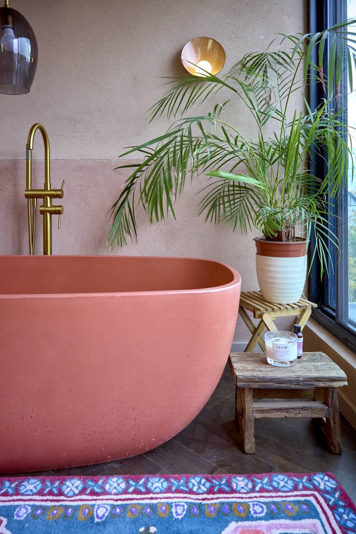 Concrete, too, was a deliberate choice. Described as “a very utilitarian material, but... overlooked a lot”, it holds a duality that feels central to this project. “Something quite brutal and utilitarian, also being whimsical and playful”. That tension defines the bath itself: a heavy, monolithic object softened by curved edges and warm pigmentation. Its smooth, matte surface sits in quiet contrast to the surrounding rough, imperfect, earthy plaster.